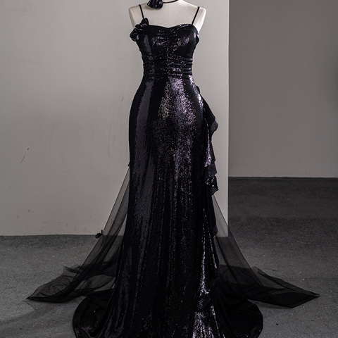 ג 'נמבר sfy97 שחור ספגטי רצועת ספגטי שחור מנצנץ שמלות ערב עם רכבת