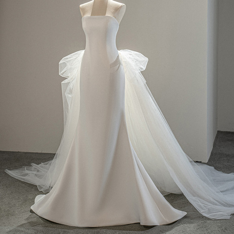 Jancember 241041 Elegante cetim plissado tule tecido sereia vestidos de casamento com trem