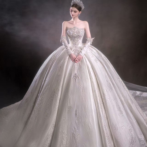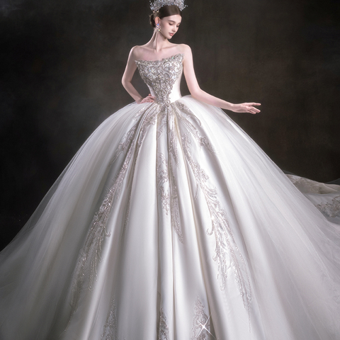 Jancer Lsht097 लक्जरी सफेद सैटिन बॉल गाउन स्ट्रैपलेस बेडेड कढ़ाई शादी की पोशाक